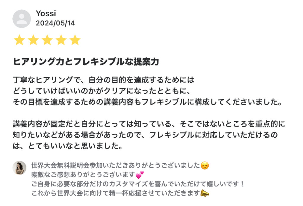 ?‍?女性|ファイナリスト|世界大会進出者無料面談|SNSへの漠然とした不安→カスタマイズ性のある講義に納得し受講